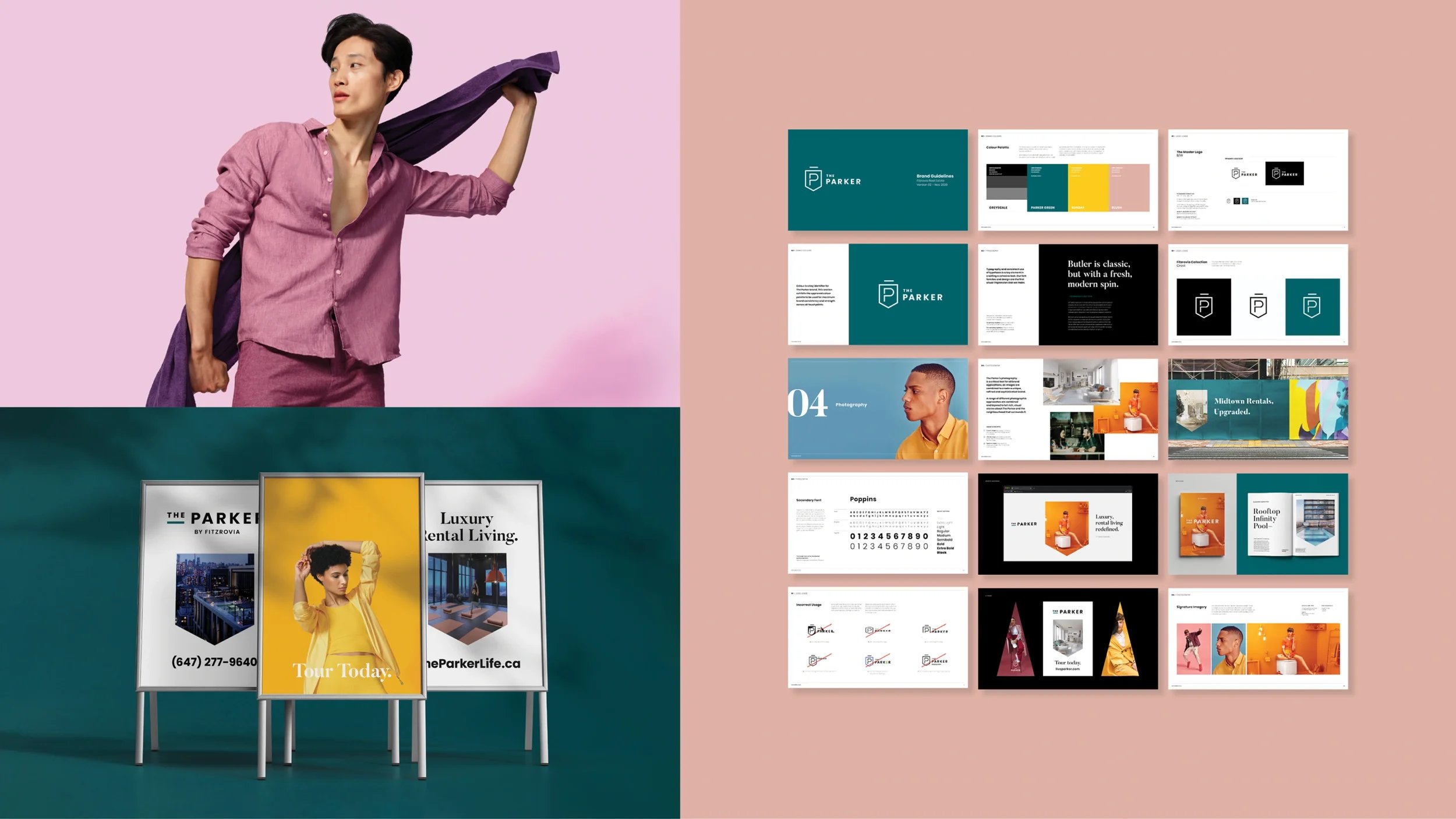 The Parker brings a fresh sense of luxury to Toronto’s Yonge and Eglinton neighbourhood. Fitzrovia set out to create a brand that felt grounded in its heritage while speaking to the pace and personality of midtown life. I led the identity work and art direction, building a system that pairs Old English richness with modern character. The result is flexible, digital-ready, and strong enough to anchor everything from leasing campaigns to on-site signage.